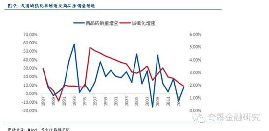 从数据上看,我国城镇化率增速和商品房销量增速的趋势也大致吻合。建国以来,随户籍制度的松动,流动人口数量大幅增加,进而推动了我国的城镇化进程迅猛发展,1996年城镇化率增速一度接近5%。2015年我国城镇化率已达56.1%,增速已降至2%左右。而根据《国家新型城镇化规划(2014—2020年)》,到2020年城镇化水平预计达到60%,年均增速在1%左右。所以,预计随城镇化进程的持续减速,住房需求不仅会进一步萎缩,同时,其后续也难有回升的动力。