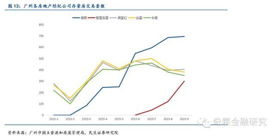 O2O思维融入房地产行业是驱动存量房时代的另一原因。互联网的介入推动了行业内的资源整合,数据共享和大数据分析加快了供求信息的匹配效率,在便捷了二手房交易流程的同时,也缩短了二手房交易的时间,进而推动了存量房交易市场的繁荣。数据显示,线上二手房中介(如,搜房、爱屋吉屋等)的进入已对传统经纪公司造成了威胁,以广州为例,搜房和爱屋吉屋等地产O2O不仅销售额持续快速增长,同时它们也日益侵蚀了原有的三大传统中介公司(满堂红、合富辉煌、 中原地产)的市场份额。预计未来这一趋势仍将持续扩大,地产O2O在蚕食传统中介公司市场份额的同时,也会催化行业资源的整合,同时,线上线下的大融合也会通过更为有效的信息匹配和便捷的服务持续推高存量房市场的需求。