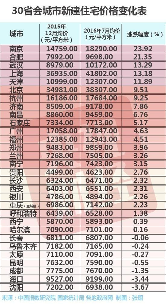 记者梳理国内30个省会城市(包括直辖市、首府;不包括“拉萨”,因缺乏数据)今年以来新房价格走势情况发现,南京、合肥、武汉三个省会城市的今年房价涨幅超过了北京、上海、天津三个直辖市。跃升为楼市“四小龙”中的南京、合肥房价涨价超两成,每平米分别涨到18290元、9698元。其中,南京房价超过广州,仅次于上海、北京。