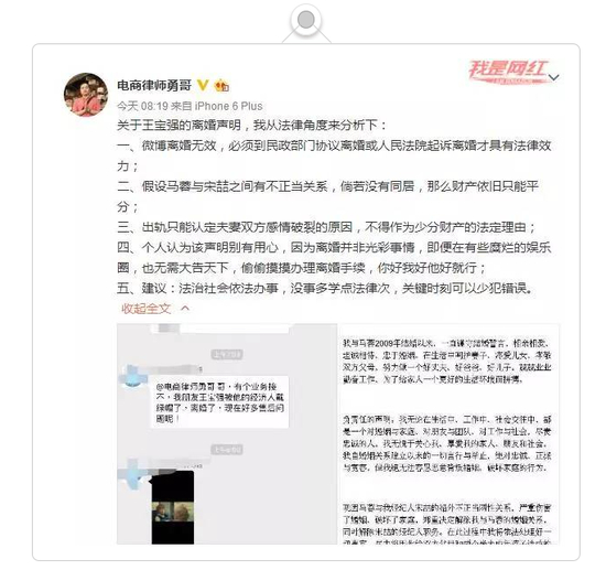 王宝强离婚事件参与群众越来越多。今日清晨,微博认证为律师陈勇的“电商律师勇哥”从法律的角度分析了宝宝的离婚声明。