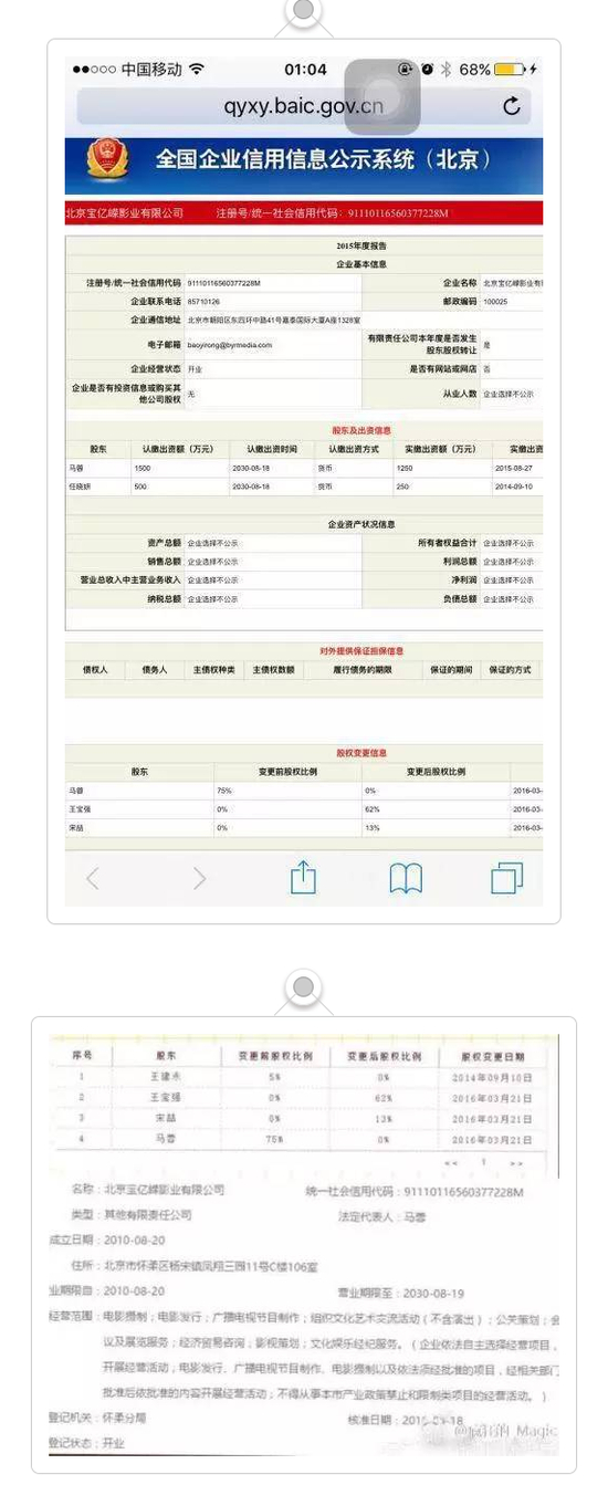 在今年3月25日和4月19日,北京宝亿嵘影业有限公司发生两次变更,王宝强成为公司唯一自然人股东。