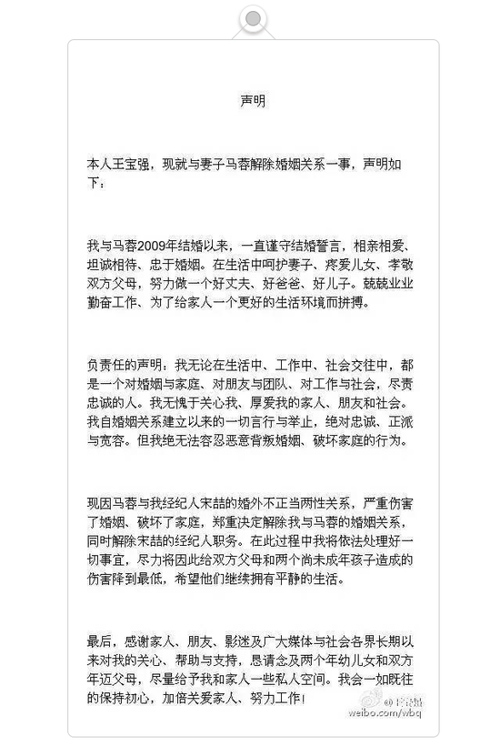 今日凌晨,演员王宝强在微博发声明,称已与妻子马蓉解除婚姻关系,因女方与王经纪人保持婚外不正当两性关系,引发热议。