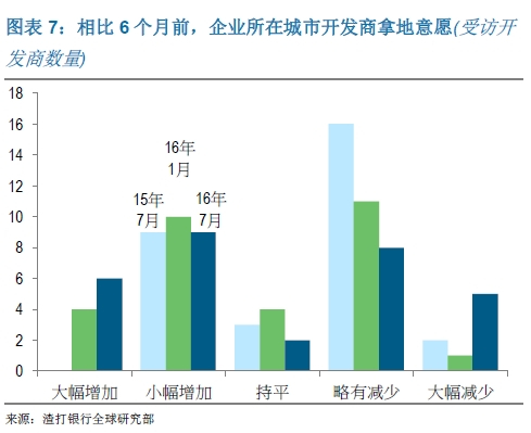 地价上涨,但土地市场显得不愠不火。地方政府土地成交量似已下滑,15家开发商称近期企业所在城市地方政府释放出的地块 较6个月前有所下降,而11家称近6个月政府释放地块数量有所增加(图表6)。