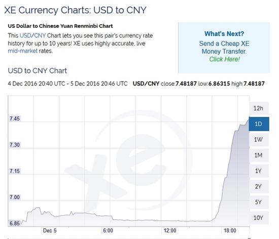美东时间周一下午,谷歌美元兑人民币报价惊现7.43,知名货币和外汇网站XE报价也给出了美元兑人民币日高7.43279的报价,引起轩然大波。