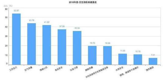 大调查细化对比发现,影响健康的主要因素依次是工作压力(53.97%)、空气质量(43.79%)、情绪心态(41.82%)、食品安全(37.26%)、饮食习惯(35.54%),选择这五项的受访者均超过三分之一。