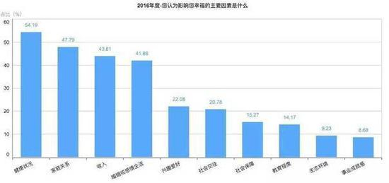 大调查发现,“健康状况”已经在百姓心中成为影响幸福感的首要因素(54.19%),其他因素是:家庭关系(47.79%)、收入(43.81%)、婚姻或感情生活(41.86%)。