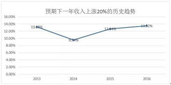 大调查数据显示,超过55%的受访者预期2017年收入会提高,与过去10年的数据对比,处于中高位置。值得注意的是,从2014年起收入高增长预期的受访者比例连续递增,预期2017年家庭收入增长将超过20%的受访者比例为13.52%,达到近五年来最高点,预期收入将持平的受访者比例也在上升。