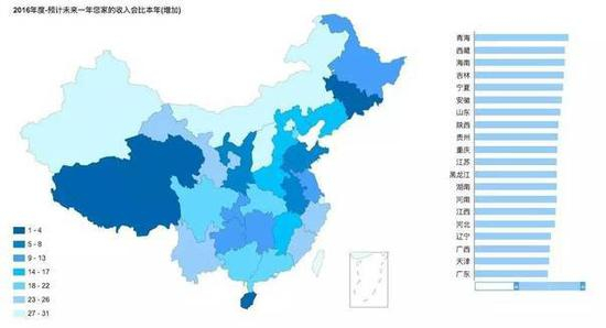 从省份看,收入信心排名前十的是青海(67.77%)、西藏(64.89%)、海南(64.86%)、吉林(64.34%)、宁夏(64.00%)、安徽(62.79%)、山东(61.79%)、陕西(60.38%)、贵州(59.80%)和重庆(59.41%)。