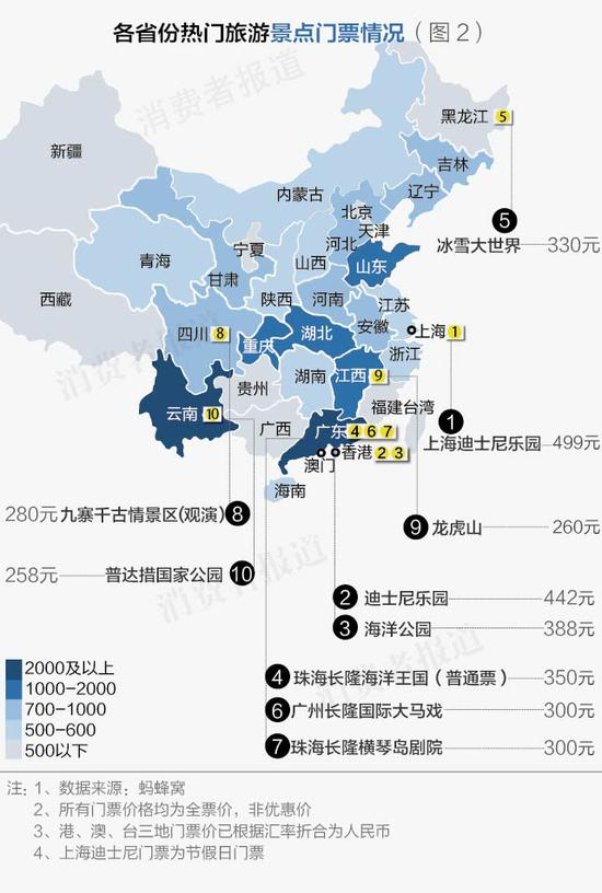 404个著名旅游景点中,223个景点为付费景点。统计各省景点收费情况显示,广东、云南、江西三省的景点合计费用分别位列前3名。此外,本刊也整理了全国收费排名前十的景点,结果显示,上海与香港迪士尼乐园费用较高。(如图2)