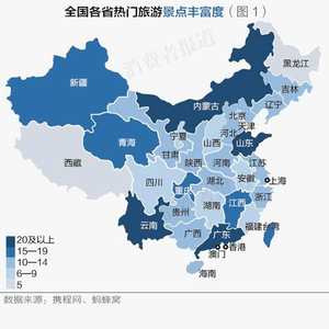 结果显示,全国各省旅游景点丰富度差异较大,其中,山东、云南、广东的热门景点数量居前三位,代表景点数分别为26、24、23。(如图1)
