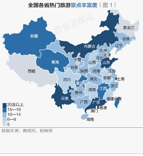 《消费者报道》根据携程的旅游推荐,挑选出各省的热门旅游城市与景点,再通过蚂蜂窝旅游网站整理出各热门旅游城市必游TOP5景点。如著名风景旅游区不在热门旅游城市,则单独列出。最终,《消费者报道》整理出各省合计404个代表性景点数目。