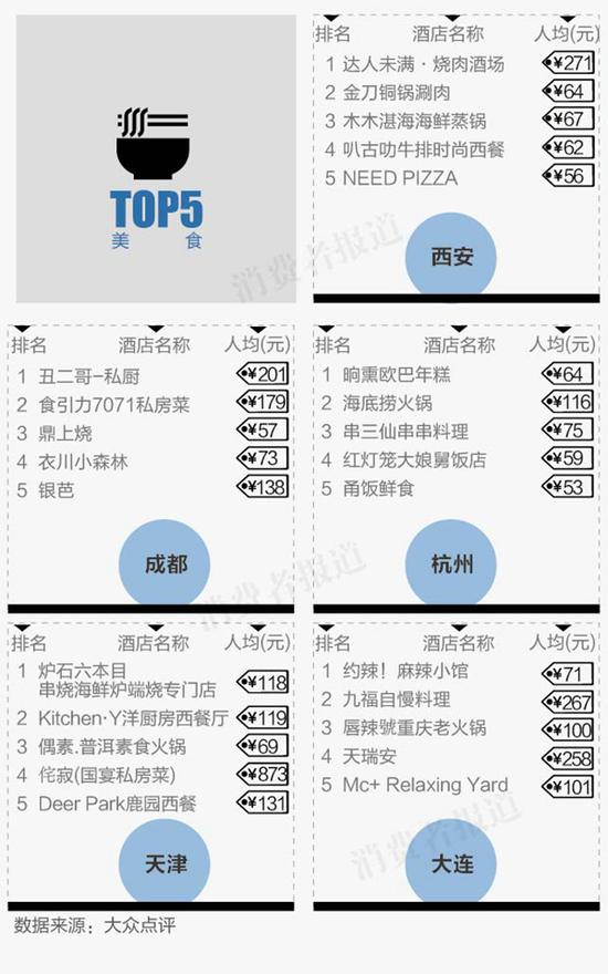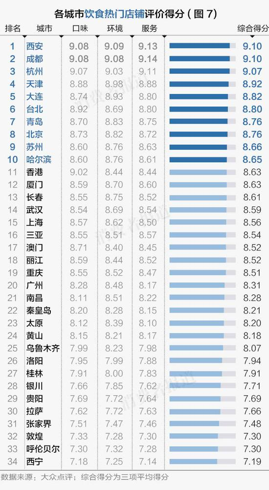 通过大众点评获得各城市美食排行榜中各约100家热门店铺评分数据,根据口味、环境、服务算出综合得分,结果显示,西安、成都、杭州、天津、大连等地美食满意度评价高,是吃货不可错过的城市。(如图7)