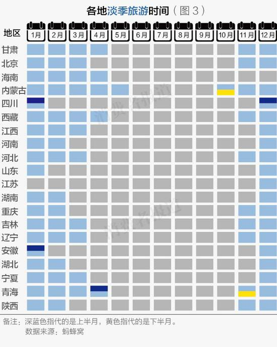 景点门票价格会根据淡旺季而有所区别,有的景点淡季门票仅为旺季门票一半。若不想去看人山人海,又想花更少的门票费享受美景,可以选择淡季出游。整体而言,各省的淡季出行时间一般集中在年初与年尾月份。(如图3)