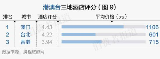 香港、澳门、台北三地对比显示,澳门的酒店评分最高,价格也是最高的。(如图9)