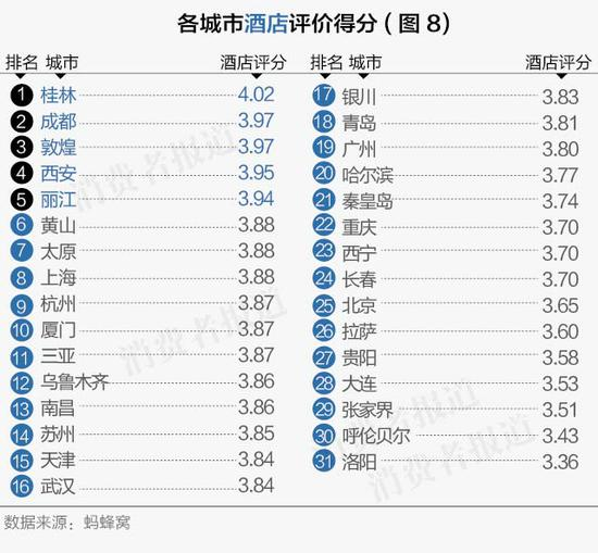 《消费者报道》通过携程获取了各城市住宿最低价在150-300元之间的酒店评价情况,算出消费者对各个城市住宿的总体满意度。另外,由于香港、澳门、台北三地住宿消费价格与内地有区别,因此另行对比。结果显示,桂林、成都、敦煌等地的住宿消费者满意更高。(如图8)