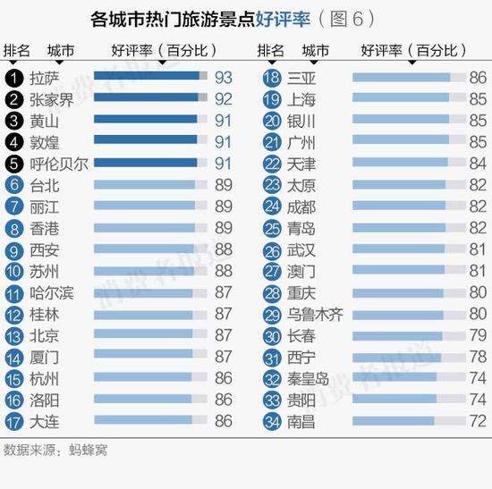通过蚂蜂窝必游Top5景点统计的47万多条景点评论情况,根据好评、中评、差评以及总评数算出各个城市必游Top景点的平均好评率。结果显示,拉萨、张家界、黄山、敦煌、呼伦贝尔5个城市消费者对景点总体满意度较高(如图6)。