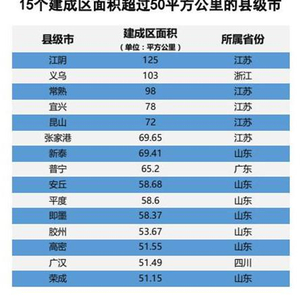 一般而言,目前很多普通地级市的建成区规模介于50到100平方公里之间。第一财经记者日前根据住建部公布的《2015年城市建设统计年鉴》,通过对我国县级市建成区面积的统计梳理辖县,目前我国有15个县级市的建成区面积超过了50平方公里,堪比地级城市。这其中,江阴和义乌最大,超过了100平方公里。