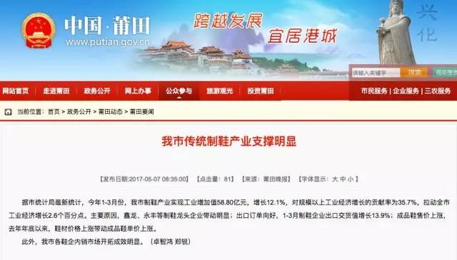 5月29日,福建莆田的官网上刊登了一篇名为《推动鞋业电商市场健康发展》的文章。