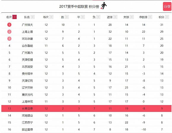 足球业内对长春亚泰曾有一句评语,“流水的豪门,铁打的长春亚泰”,意指该俱乐部长期徘徊在降级边缘。根据2017赛季中超联赛球队统计,长春亚泰目前在全部16只中超球队中排名13位,已比赛场次12场,胜2平3负7,进球11个,失球19个,球队保级压力颇大。