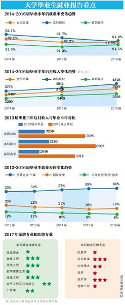 昨日下午,由麦可思研究院撰写、社会科学文献出版社出版的《2017年中国本科生就业报告》在北京发布。报告对14.7万2016届大学本科毕业生和14.2万高职高专毕业生进行跟踪调查,并对11.4万2013届大学本科毕业生三年后的就业和收入情况再次调查。