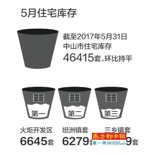 截至2017年5月31日,中山市住宅库存46415套,环比持平。其中火炬开发区以6645套居全市镇区住宅库存榜首,坦洲镇6279套排名第二,三乡镇镇4909套居第三。
