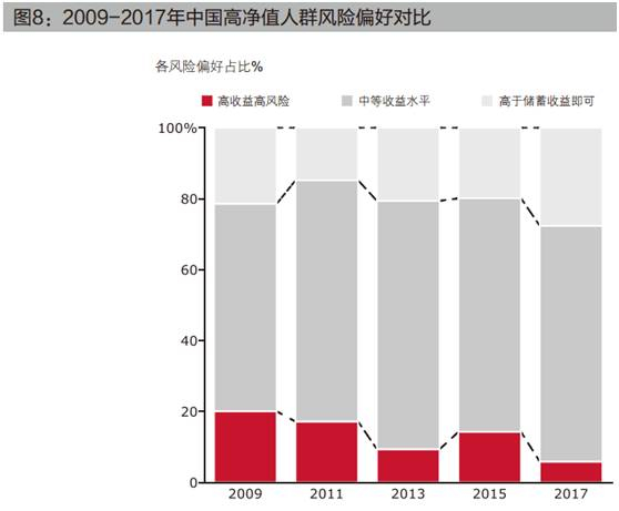 从风险偏好的数据来看,选择“高风险高收益”投资的高净值人群比例约占5%,相较2015年下降了近十个百分点;倾向于“高于储蓄收益即可”的人群比例则从2015年的20%左右大幅上升至2017年的近30%;与此同时,偏好“中等收益水平”的人群比例稳定在60%左右。