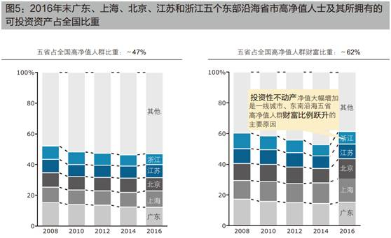 具体来看,高净值人士数量超过10万人的省市共5个,分别东南沿海五省市:广东、上海、北京、江苏、浙江,占全国比重47% 。