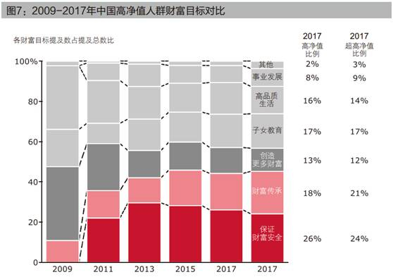 在2009年及2011年的调研中,“创造更多财富”均高居中国高净值人群的财富目标首位。 2013年,随着高净值人士初步完成辛苦打拼事业的奋斗期,愈发看重如何更好保障自己和家人今后的生活,“保证财富安全”首次跃升首要财富目标,同时“财富传承”的重要性日益增强。近年来,“保证财富安全”、“财富传承”和“子女教育”一直作为高净值人群最关注的财富目标,“创造更多财富”则被挤出前三位。