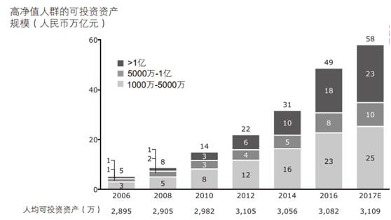 2016年,中国的高净值人群数量达到158万人;与2014年相比,增加了约50万人,年均复合增长率达到23%,相比2012年人群数量实现翻倍。其中,超高净值人群规模约12万人,可投资资产5千万以上人士共约23万人。