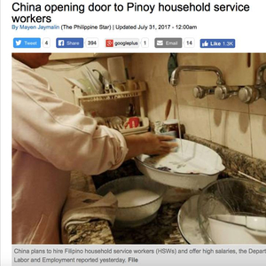 7月31日,“菲律宾星报”网站报道称,菲律宾劳动就业部7月30日发布一份报告称,中国打算聘请菲律宾家政服务人员前往中国5个大城市就业,并承诺给予这些菲佣这10万比索月薪(约合人民币1.3万)的月薪。