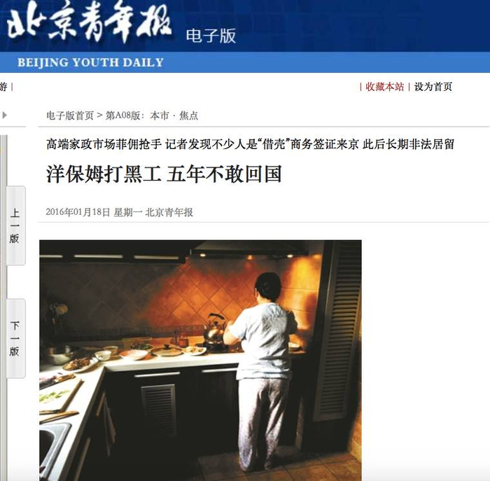 国内家政市场早已有许多菲佣,还有中介专门做菲佣的生意。《北京青年报》记者致电多家大型家政公司询问是否可以雇佣到菲佣,一家大型家政公司的负责人表示可以留下电话,公司海外业务部门的同事会与记者联系。不一会儿,记者就接到了该公司海外业务部门客服的电话;另一家政公司的客服人员称,目前没有合适人选,不过可以帮记者留意,有的话会随时告知;在58同城、百度贴吧等渠道内,还可以搜索到多家菲佣中介的联系方式。