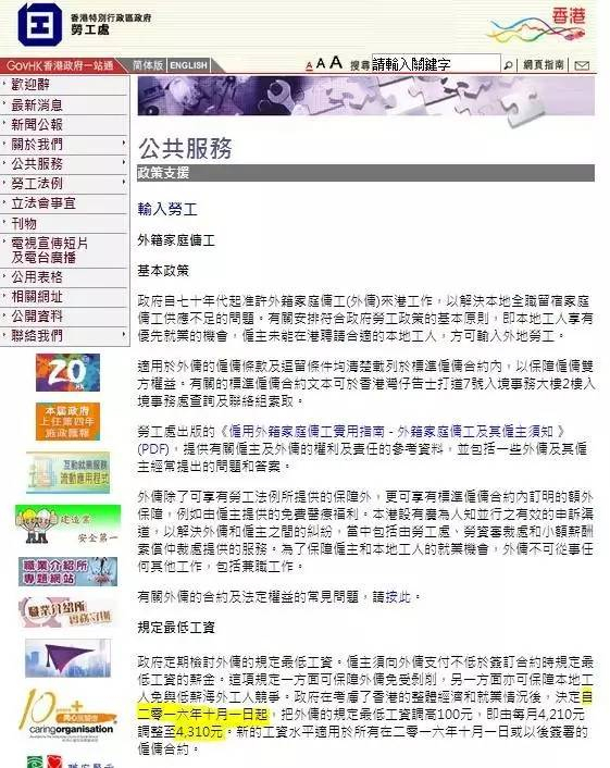 香港政府对菲佣有最低工资限制,并定期修改这一工资标准,近些年几乎是每年增长100港元。2016年10月起,政府将最低工资标准由每月4210港元调整至4310港元(约为3700元人民币)。政府对菲佣也有保护,为其提供劳工法等保障,还设有各种申诉渠道,解决雇佣双方的纠纷。