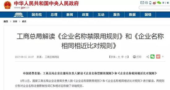 8月11日,国家工商总局企业注册局负责人就《企业名称禁限用规则》(以下简称《禁限用规则》)和《企业名称相同相近比对规则》(以下简称《比对规则》)进行了解读。
