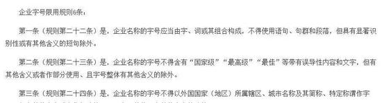 每经小编(微信号:nbdnews)在《禁限用规则》中看到规定,企业名称的字号应当由字、词或其组合构成,不得使用语句、句群和段落。