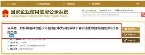 除了“宝鸡有一群怀揣着梦想的少年相信在牛大叔的带领下会创造生命的奇迹网络科技有限公司”以外,奇葩的公司名称层出不穷,比如“深圳赚他一个亿科技有限公司”等。