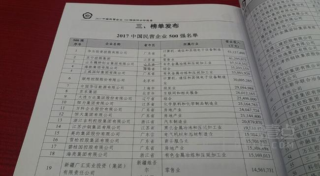 2017中国民营企业500强公布:华为苏宁山东魏桥居前三