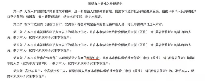 据中国新闻网消息,无锡为租房落户设置的门槛是:参加城镇社会保险、申领(签注)《江苏省居住证》均满五年(宜兴为均满三年)。同时,居民之间签订的未经过备案的房屋租赁协议不能作为落户条件,须租住经房管部门办理租赁登记备案的租赁住宅才能办理落户。