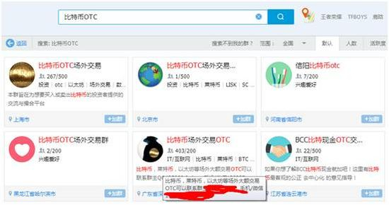 严监管之下,比特币逐渐由场内交易转为场外交易。目前以微信群、QQ群为载体的比特币交易异常火热,而在QQ搜索中,随便输入“比特币OTC”,就会出现各种比特币场外交易群。