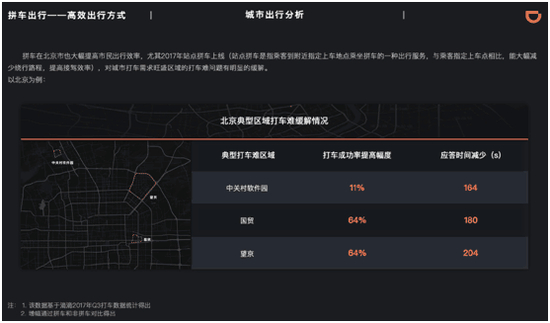 拼车可大幅度提高市民出行效率,尤其是站点拼车上线后,对打车需求旺盛区域有明显缓解。根据浙江大学交通工程研究所的研究,拼车对整个城市交通系统会产生较大正收益,在需求高峰时段拼车与非拼车相比,可使所有车辆的单位行程载客量提高27%。在最难打车排名第3的上海,外滩、陆家嘴、虹桥火车站、黄浦体育馆是最难打车的地区,但如果选择拼车,可提升陆家嘴地区打车成功率152%,平均每次打车应答时间快25秒;在北京国贸,拼车使打车成功率提高64%,应答时间减少180秒。