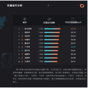 北京拥堵缓解效果最好的区域为永宁古城墙遗址附近,TTI(交通运行指数)环比下降8.68%,京港澳高速作为国家重点推进的物流通道之一,第三季度拥堵缓解效果最为明显;在上海,远郊的兴梅路尚乐坊等地拥堵改善效果较好,市区中吴中路指标下降最快;广州改善效果最好的区域是吕田镇政府附近,最好的路段是工业大道中段和北段,TTI环比下降20%;深圳治堵最有效的区域集中在购物旅游场所,美食街香蜜湖路也成效显著。