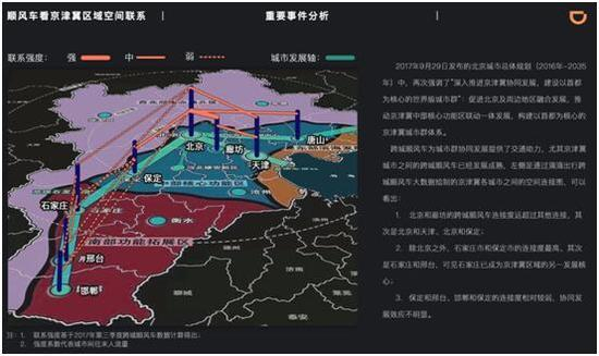 区域发展,交通先行,跨城顺风车为城市群协同发展提供了交通助力,在京津冀城市空间连接图中可以发现,北京和廊坊的跨城顺风车连接度远远超过其他城市,其次是天津、保定和唐山。除北京外,石家庄和保定市的连接度最高,其次为石家庄和邢台,可见石家庄已成为京津冀区域的另一发展核心。