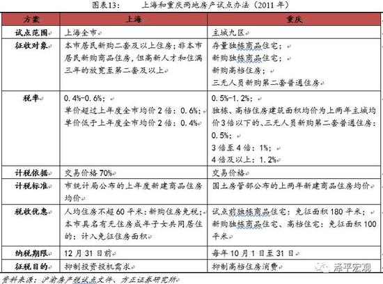 上海和重庆的试点方案应该是未来全国推广房产税的重要参考方向,他们主要具有以下几点共同点:1)征税重点以新增购房为主,同时,买高价房就要交更多的税;2)差别化税率。上海有两档,重庆有三挡,控制高档住房的比例;3)较为宽松的免税政策。这样可以减少因为房产税对居民的基本住房需求的侵害;4)限制外来的投资需求。根据是否为本地居民采取不同征税条件。