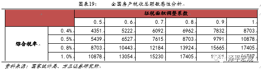 2015年,全国总人口为1.37亿,常住人口城镇化率56%,2012年全国城镇人均住房建面32.9平,照此估算全国城镇住宅建面253.8亿平。2016年上半年全国商品住宅销售金额5.76万亿元,销售面积6.7万平,均价8573元/平米。因此估算当前全国城镇住房存量价值为217.6万亿元。若按照1%的房产税率,每年房产税总额2.18万亿。但事实上,我们认为如果针对存量房征收,每年征税总额远小于此值。一方面,按照国际通行准则,房产税通常会根据住宅类型、住宅面积等因素形成超率累进税率,因此综合税率会低于1%。另一方面,实际征收面积远低于253.8亿平,主要因为:一是为保障刚需,将设置较高免征面积,杭州方案中的免征面积为人均60平;二是中国大量存在的小产权房等难以统计和确权的房产;三是在城镇居住6个月以上即计入常住人口,大量农民工等流动人口并未在工作和居住的城镇买房,当前中国户籍人口城镇化率仅40%。我们按照综合税率和征税面积对全国房产税测算总额进行敏感性分析,实际征税收入将远小于2.18万亿。