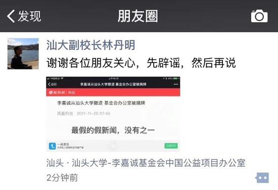汕头大学副校长林丹明于今天10时38分发布微信朋友圈,转发了包含“李嘉诚从汕头大学撤退 基金会办公室被摘牌——最假的假新闻,没有之一”字样的图片,并评论“谢谢各位朋友关心,先辟谣,然后再说”,定位地点显示为“汕头大学 李嘉诚基金会中国公益项目办公室”。
