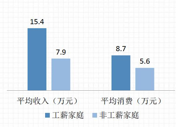 调查数据显示,工薪家庭的年平均收入为15.4万元,非工薪家庭只有7.9万元;工薪家庭年平均消费8.7万元,高于非工薪家庭的5.6万元;两者在包括房产在内的家庭总资产差距更大,工薪家庭的总资产为177.6万元,非工薪家庭为91.6万元。