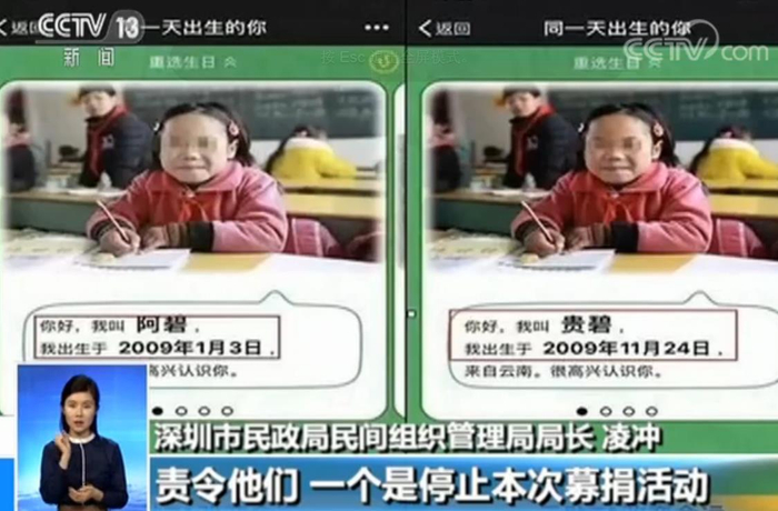 深圳市民政局民间组织管理局局长凌冲向央视记者表示,已责令他们一个是停止本次募捐活动,第二个是提交本次募捐活动的情况报告,第三个是把所有本次活动有关的在网络上发布的相关的资料提交给我们。在今年4月与云南省昭通市镇雄县扶贫开发办公室和北京零分贝科技有限公司,合作推出了“分贝筹”微信公众号应用产品。而“同一天生日”活动,原定于12月24日正式发布,但在22日晚,该活动在测试阶段意外泄露,由于活动还处于测试阶段,导致部分受助儿童的信息出现误差,决定停止该项目。