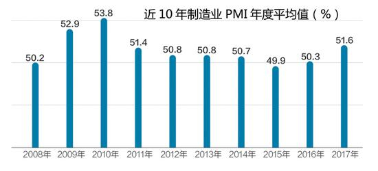 而从近10年来的PMI年度均值来看,2017的成绩更是不俗,同样达到了51.6%的水平。这也成为2010之后7年来的最高点。