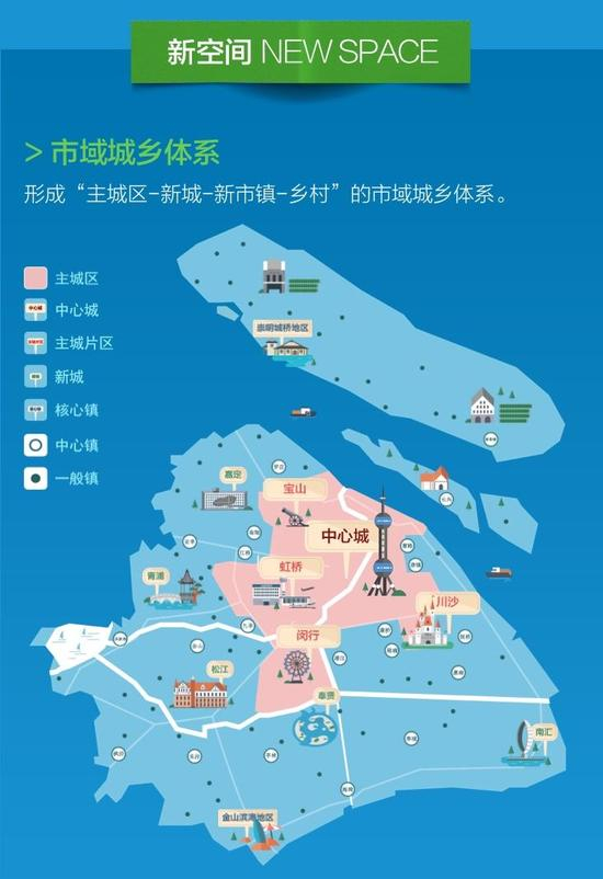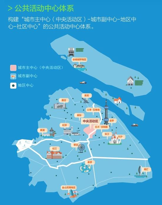 中央活动区包括小陆家嘴、外滩、人民广场、徐家汇等十几个区域,重点发展金融服务、总部经济、商务办公、文化娱乐、创新创意、旅游观光等全球城市核心功能。城市副中心包括五角场等9个主城副中心、5个新城中心和金山滨海地区、崇明城桥地区2个核心镇中心等,发展面向长三角和市域的综合服务中心,兼顾全球城市部分核心功能。地区中心和社区中心主要承担所在区域的公共服务。