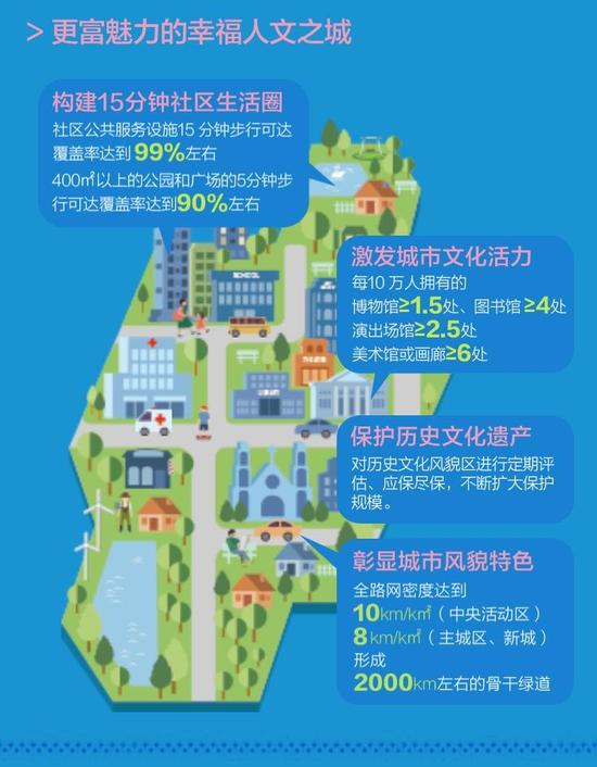 打造15分钟生活圈,营造幸福宜居社区。包括:打造宜居、宜业、宜学、宜游的社区,优化社区生活、就业和出行环境,建设TOD社区,为城市居民提供一个全时段运营的城市。提供覆盖全年龄段的公共服务保障,社区公共服务设施15分钟步行可达覆盖率将达到99%左右。加快建立多主体供给、多渠道保障、租购并举的住房制度。多渠道增加租赁性住房比重,至2035年,政府及机构持有的租赁性住房比重约8-10%。提供人才公寓、国际化社区、适老性住宅等满足市民多层次、多样化的住房需求。