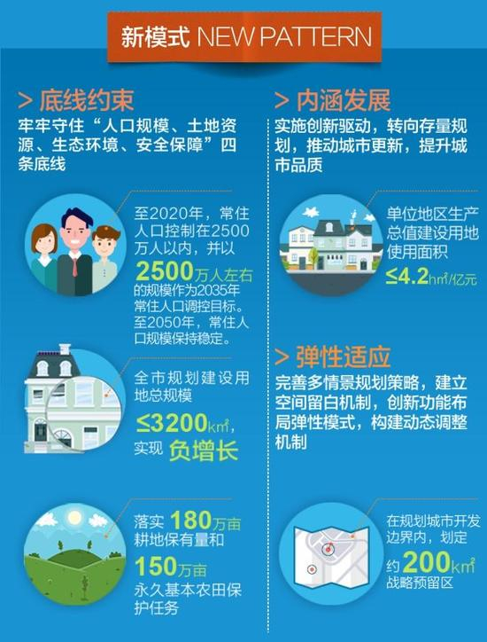 人口规模方面,严格控制人口规模,缓解人口快速增长与资源环境紧约束之间的矛盾,至2035年常驻人口控制在2500万人左右,并作为长期调控目标。在常住人口基础上,以实际服务人口需求进行公共资源配置,提高城市对服务人口的基本保障能力。城市住房养老、基础教育、体育、绿地等基本公共服务设施以满足常住人口需求为主。水、能源、安全、交通等设施需要满足实际服务人口的需求,规划考虑在常住人口基础上预留20%以上的弹性。文化、医疗、教育、体育等高等级公共服务设施需要满足常住人口以及更大区域内人群的需求。